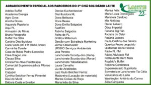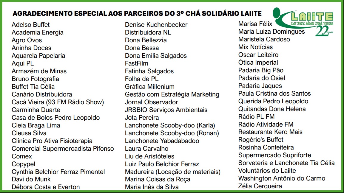 Compareceram 180 pessoas, que reafirmaram o compromisso da comunidade com o Laiite e, ao mesmo tempo, usufruíram de uma tarde espetacular, para a qual contribuíram 22 voluntários e dezenas de parceiros, entre padarias, lanchonetes, restaurantes e confeiteiro da cidade. “Juntos, patrocinadores, público presente e voluntários mostraram concretamente que a solidariedade tem força para transformar vidas”, observou a coordenadora administrativa do Laiite, Ana Clara Vitorino.