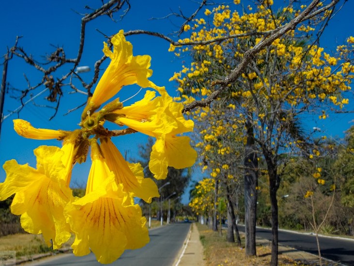 Os ipês estão floridos na nossa cidade. Estão por toda parte: centro, distritos e bairros, como na fazenda modelo. Entre julho e setembro, eles nos brindam o olhar com a beleza que apresentam! Passei hoje por alguns lindos ipês, próximos ao topo do viaduto do Bairro Santo Antônio, que já havia fotografado. Disse ao meu filho, Artur, de nove anos, que iria fotografá-los novamente. Artur perguntou o motivo pelo qual eu faria isso. Expliquei que faria uma nova composição, uma luz diferente, um fundo mais rico.